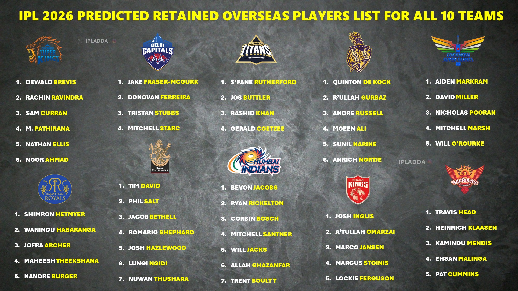 IPL 2026 Predicted Retained Overseas Players List all 10 Teams – Featured Image IPL 2026 Predicted Retained Overseas Players List all 10 Teams – Featured Image